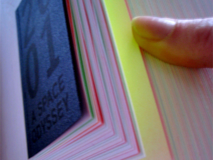 Typografische benadering van het screenplay van de film '2001: A Space Odyssey' uit 1965. In de film staat onder andere de zwarte monoliet centraal welke staat voor de menselijke ontwikkeling. De lezer ervaart het verhaal in dit op bijzondere wijze gebonden boek, schiet door een kleurrijke tunnel en vergaart per pagina meer kennis.