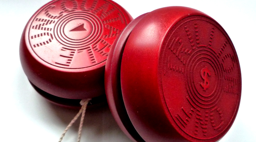 Een trillion dollar munt om de crisis in Amerika tegen te gaan. Heel het plan roept veel vragen op. De jojo staat symbool voor hoe ik tegenover dit idee sta. Geld moet rollen, maar men wil het niet kwijtraken (het touwtje). Hoewel Amerika van de hoge schulden af willen zal het, wanneer ze zo door blijven gaan als nu, weer terugkomen. Uiteindelijk hebben ze het allemaal zelf in de hand. Hoe langer het touw hoe meer ze in het rood komen te staan. De twaalf cirkels die ontstaan door het draaien staan voor de twaalf nullen in een trillion.